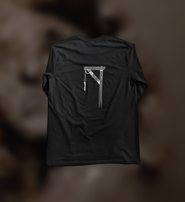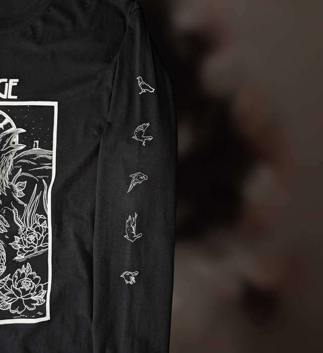 An ominous raven humanoid, snakes and flowers adorn the front of this long sleeve shirt, and the sleeves feature various birds in flight. The back design displays a gallow, an homage to our band name.
