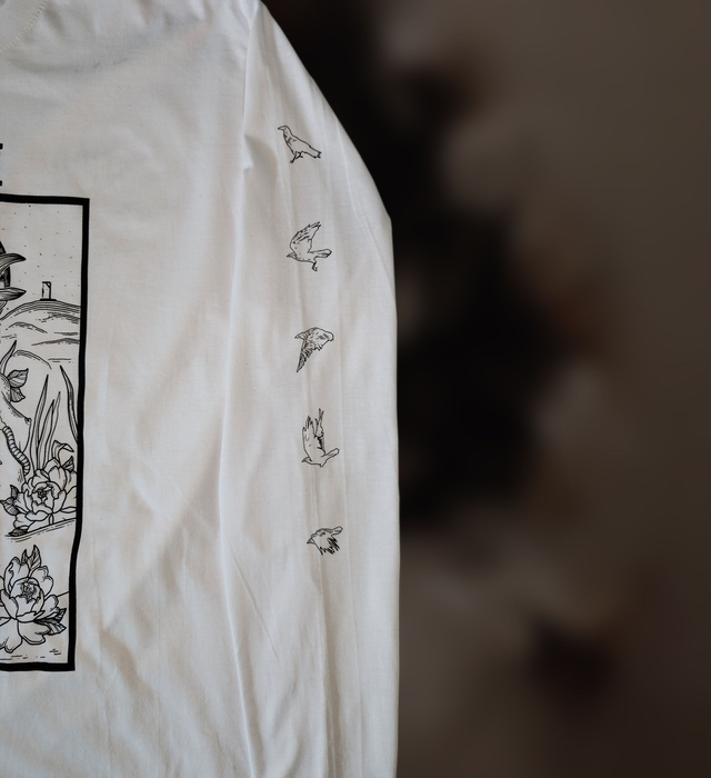 An ominous raven humanoid, snakes and flowers adorn the front of this long sleeve shirt, and the sleeves feature various birds in flight. The back design displays a gallow, an homage to our band name.